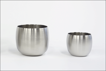 へら絞り技術で作られたステンレス製のビアタンブラーとロックグラスとぐい呑みです。へら絞り技術とプレス加工を組み合わせることで通常難しい飲み口の狭まった形状を実現しました。ステンレスならではの極薄の飲み口と持ちやすい形状、そして全体の美しさを追求して日用品 としての完成度を高めています。