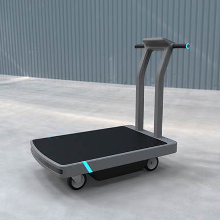 自動走行と従来の手押し台車のようなハイブリットな使い方を可能にしています。そのため従来の台車のようなスタイリングを踏襲し、ルート設定を行う操作パネルや非常停止ボタンは取っ手の中央に配置し、使い勝手を良くしています。