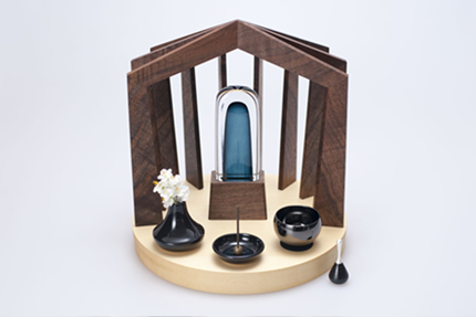今までの四角い仏壇ではなく、位牌を住人と捉え「いどころ→住まい→家の形」という発想から現代のインテリアにも合うような、家のような仏壇を作り出しました。ただし完全に囲ってしまうのではなく、実際の家を構成する柱と梁の部分だけで構成し、仏壇の外と内側をあいまいにして故人と残された家族を繋ぐような形状を目指しました。柱と梁を構成する木の組み方が美しい仏壇です。