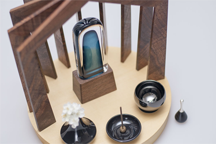 今までの四角い仏壇ではなく、位牌を住人と捉え「いどころ→住まい→家の形」という発想から現代のインテリアにも合うような、家のような仏壇を作り出しました。ただし完全に囲ってしまうのではなく、実際の家を構成する柱と梁の部分だけで構成し、仏壇の外と内側をあいまいにして故人と残された家族を繋ぐような形状を目指しました。柱と梁を構成する木の組み方が美しい仏壇です。
