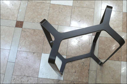 構造の美しい見た目のシンプルなコートハンガーです。コートが掛かっていない時の存在感もデザインの対象としました。シンプルな構造は強度が心配になりますが、それぞれの柱に角度をつけることで、横方向に力が加わりある柱に負荷がかかってゆがみ始めても、他の柱が曲がりにくい角度になっているため全体的に元の形を保とうとする構造になっています。また四隅の柱をつなぐ上下の構造は、数学の最短シュタイナー問題を用いた形状となっています。